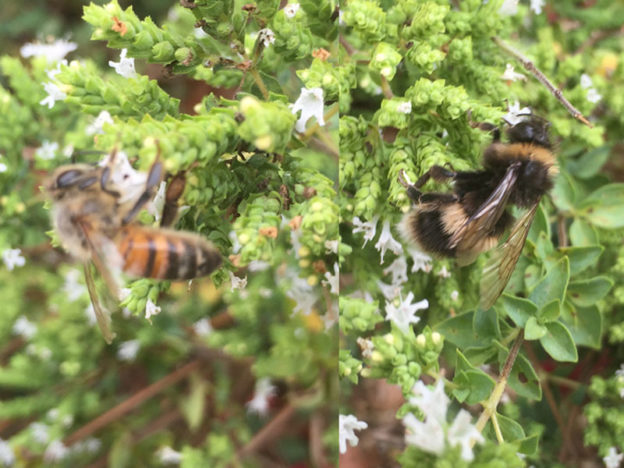 Bees, such as honeybees, bumblebees, and carpenter bees swarm around herb blossoms; they simply love these flowers. The image here shows  a honeybee and a carpenter bee. Carpenter bees are particularly plump and large, with long hair covering their entire bodies.  They fly around with a loud buzzing sound, and as children, we called them “kumambachi,” thinking, “Being stung by such a huge bee  would be dreadful.” However, contrary to this belief, carpenter bees are unthreatening. They’re surprisingly gentle—they’ll land on your hand.