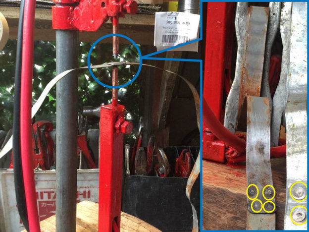 Typically, a brush cutter has a circular saw blade or nylon line attached to a high-speed rotating shaft. By rotating it close to the ground and  moving it in a fan shape from side to side, weeds are trimmed at the base. For this modification, I attached a strong iron plate to the rotating  shaft. Near each end of this plate, I drilled holes and inserted two 10mm diameter bolts, each about 5cm long, securing them firmly with nuts.  I immediately tried it out to see how it would perform.