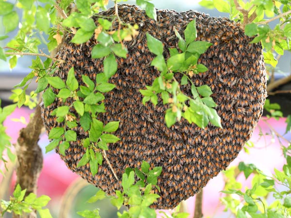 تجمّع سربٌ من النحل في كتلة كبيرة متدلّية من تعريشة كرمة العنب القريبة من الخلية، مشكّلًا عنقودًا متماسكًا. لو لم أتحرّك بسرعة، لكان من الممكن أن يفرّ السرب. لذا سارعتُ إلى تجهيز خليةٍ فارغة وثبّتُها مباشرةً أسفل تجمع النحل، ثم هززتُ الغصن الذي كانوا معلّقين به لإسقاطهم. وبما أنّ الملكة تكون عادةً في قلب السرب، فما إن تدخل الخلية حتى يتبعها الباقون، وبهذا تتأسس مستعمرة جديدة بسلاسة.